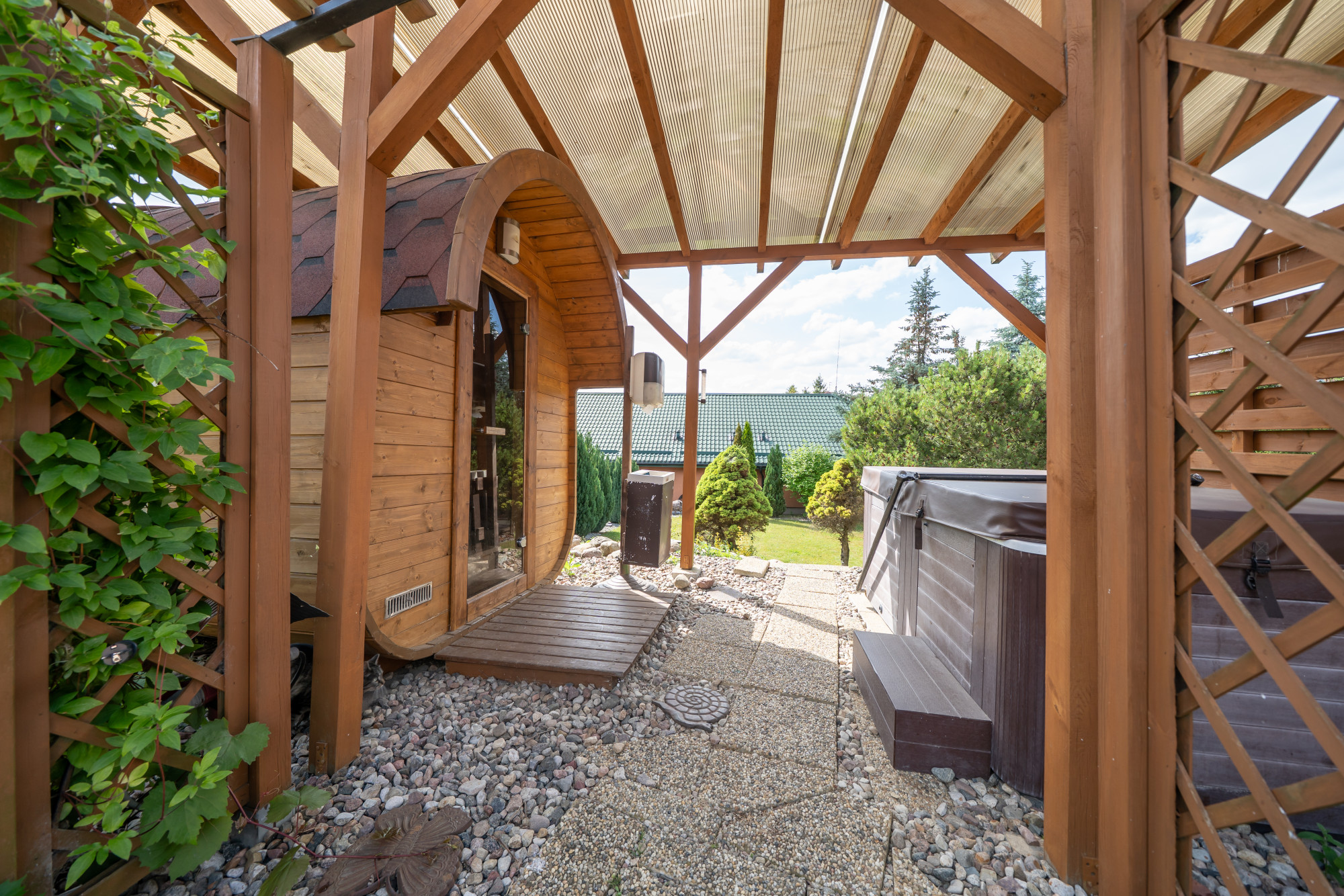 Nieruchomość posiada zewnętrzna część wypoczynkową, saunę oraz jacuzzi wraz z zadaszeniem oraz zadbany ogród z licznymi nasadzeniami które idealnie odgrodzą od sąsiadów i ulicy.